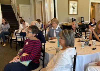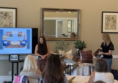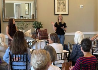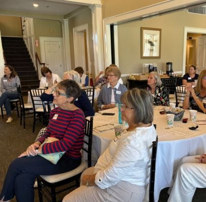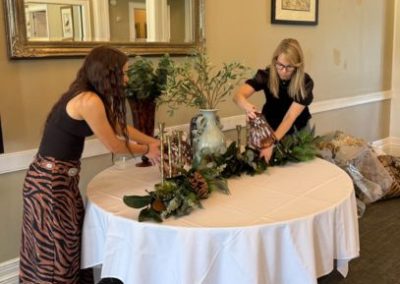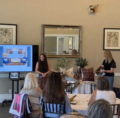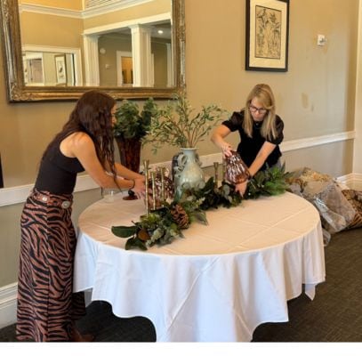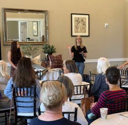 At the October Home & Garden Club meeting, designers from Ballard Designs demonstrated how easy seasonal touches can incorporate fall colors into a typical home décor. Designers Christine Cunningham and Amanda Yonkers, began by noting that the cooler tones of a coastal vibe—a favorite design style of many Jacksonville homeowners—will work well with the warmer tones of browns, sages, purples and rusts used during the autumn months. “Your pumpkins do not need to go away,” said Christine. “These colors can be friends.”