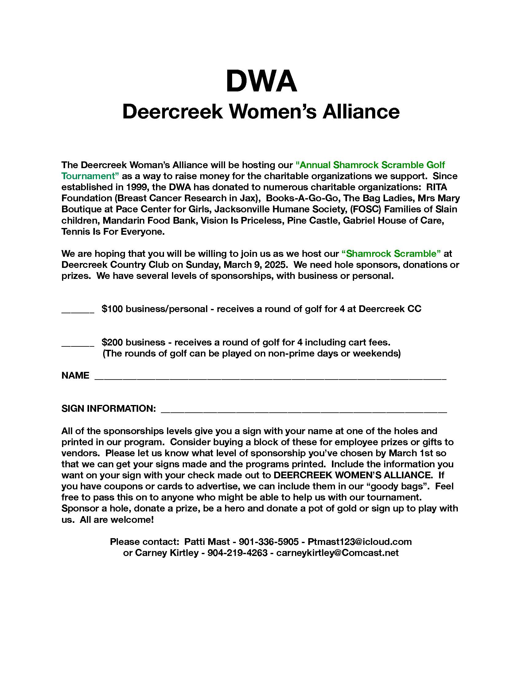 The format will be 4-person teams – men, women and mixed teams. A wonderful Irish-themed meal and a raffle will follow golf. This is one of our main fundraising events and proceeds go to the local charities that the DWA supports.