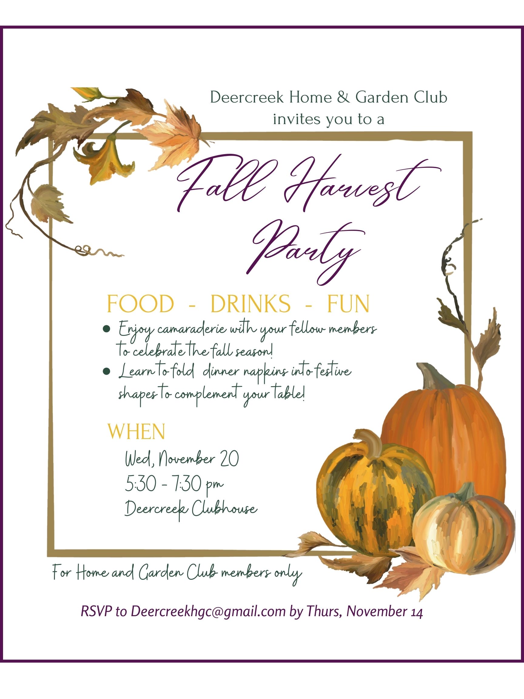 Home and Garden Club members are invited to celebrate the fall season at a Fall Harvest Party!
