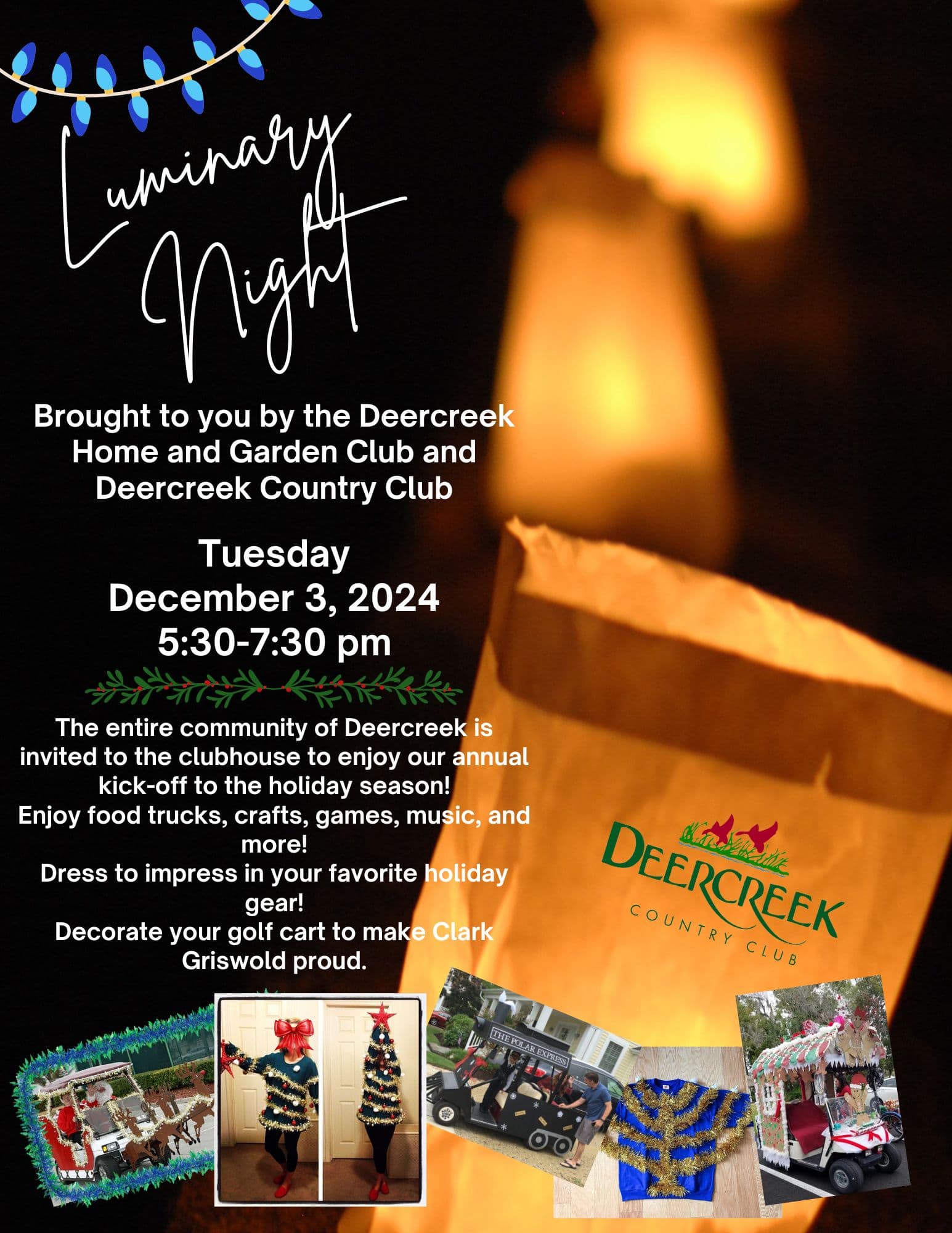 All of Deercreek is invited to attend the Luminary Night at the Deercreek clubhouse. Sponsored jointly by the Deercreek Home and Garden Club and the Deercreek Country Club, celebrate the upcoming holidays with your family and friends.