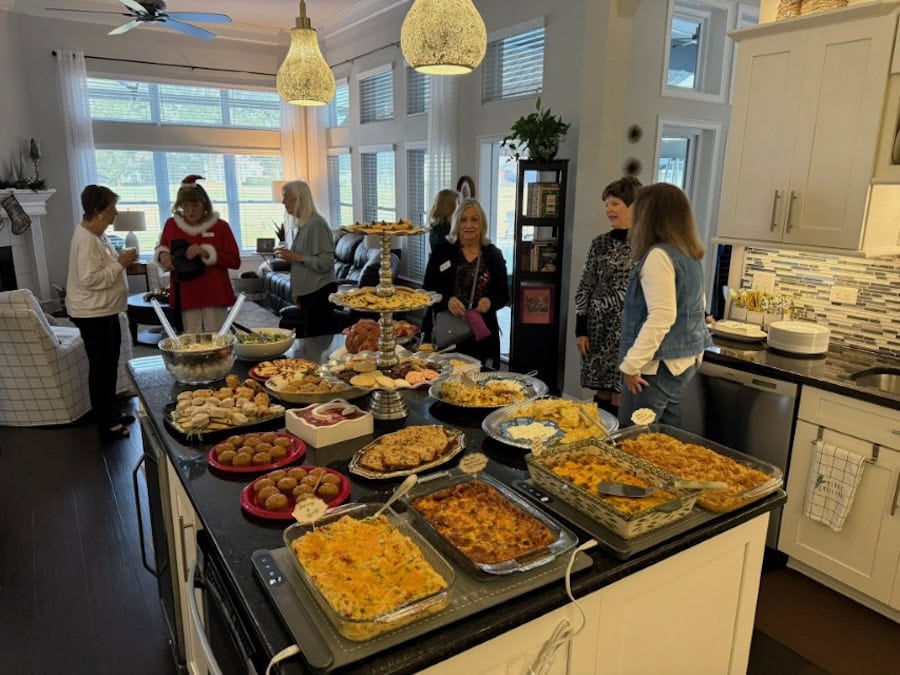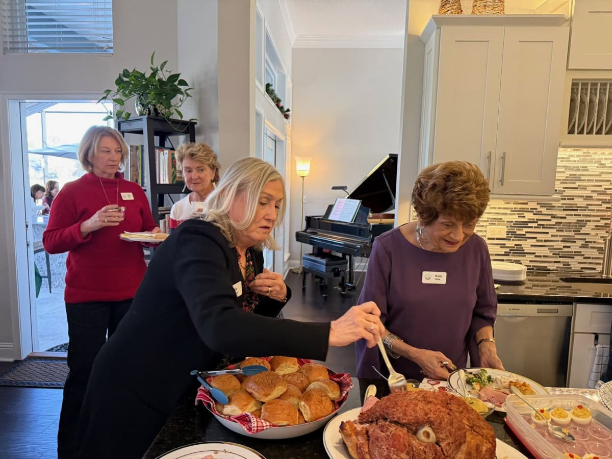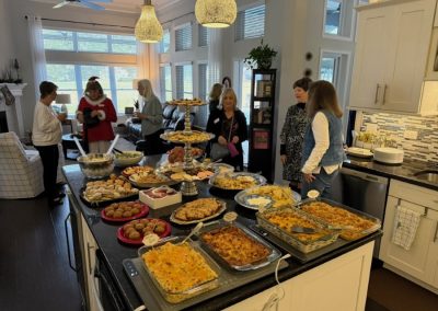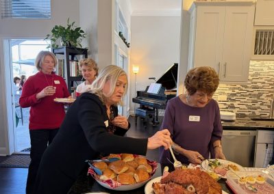 The home, located on Persimmon Hill Drive, overlooks the DCC course’s sixth green and offered a picturesque view as the ladies dined on a scrumptious brunch fare provided by members of the HGC Board. The menu featured a variety of egg casseroles, a hashbrown casserole and a French toast casserole, along with shrimp and grits, deviled eggs, ham and rolls, spinach salad, breakfast breads, and cookies. To honor the diversity of the neighborhood, Board members prepared Kugel dishes to remember Hanukkah and Pavlova, a meringue dessert favored in Europe and Australia.