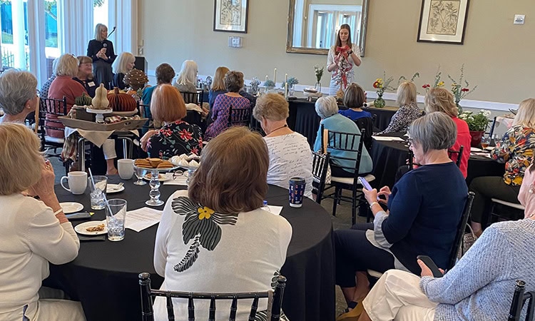 The Home and Garden Club’s October program was an interesting presentation by Barbara Ondo Designs, a local interior design firm. Barbara Ondo Morrison and her daughter Caeligh Morrison demonstrated how to make ‘centerpieces’, using baskets, serving pieces and other decorative objects in the home. Each table in the Deercreek clubroom had a different ‘tablescape’ on it, and the presenters provided tips and tricks for making them.