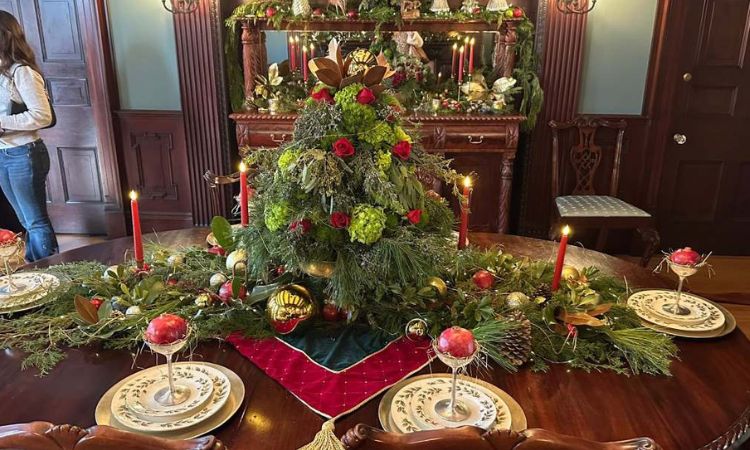 The decorated homes were filled with hundreds of flowers, garlands, wreathes and candles reminiscent of decorations in the late 19th Century. Combinations of roses, poinsettias, hydrangeas and peonies, intertwined with foliage, palm fronds and ribbons, created beautiful displays on mantles, tables and countertops. Period architecture and furniture further enhanced the historical period. Many of the homes have been remodeled with modern conveniences while still maintaining the authenticity of the era.