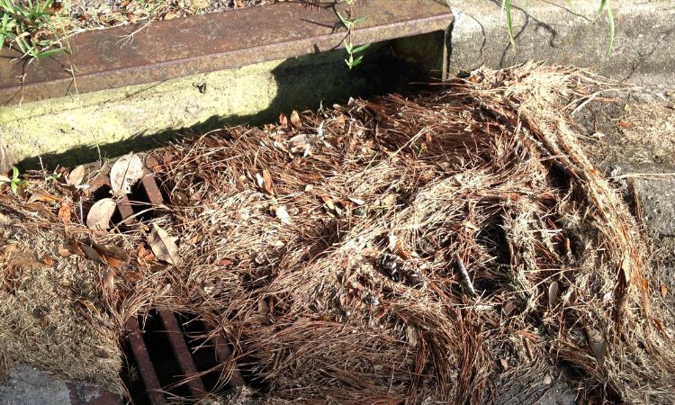 The photo highlights a drain covered with pine needles and debris, leading to drainage issues during rain. Many drains in the community face a similar problem. The Homeowners Association bears the cost of fixing clogged drains, as it’s not the city’s responsibility. Cleaning all drains is expensive due to accumulated debris over the years (grass clippings, leaves, bottles), covering over ten miles of roads and their drainage systems. Debris in drains eventually reaches lakes, including from lawn maintenance workers blowing grass clippings into the lake.
