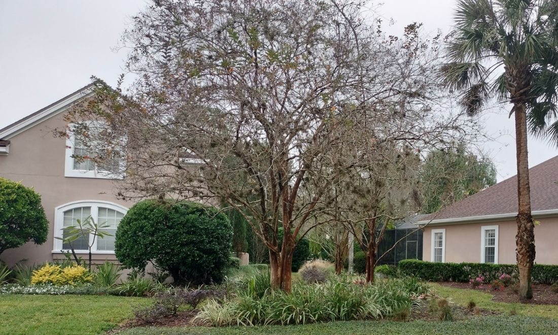 Asiatic jasmine is a monoculture that works, but variety provides more interest. As shown, on the right side of the home is a large triangular shaped planting bed. This bed reduces the amount of turf and provides a natural break between this home and the next. This large planting bed features a variety of plants (trees, shrubs and grasses), most of which look good year-round. The few which do not stay green through the winter provide shelter and food for the wildlife. Most of these will return from their roots, only requiring a quick trim after it starts to warm up.