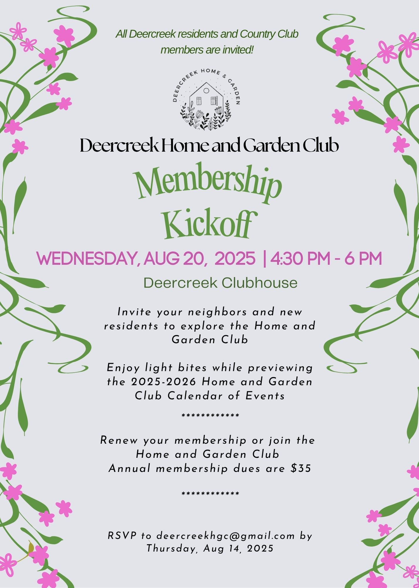 Deercreek Clubhouse FLAll Deercreek Residents and Country Club members are invited to the Deercreek Home and Garden Club’s Membership Kickoff! Learn about upcoming programs for the club and how you can participate in the Home and Garden Club’s activities. See flyer (below) for more info and RSVP by August 14, 2025 for the kickoff.
