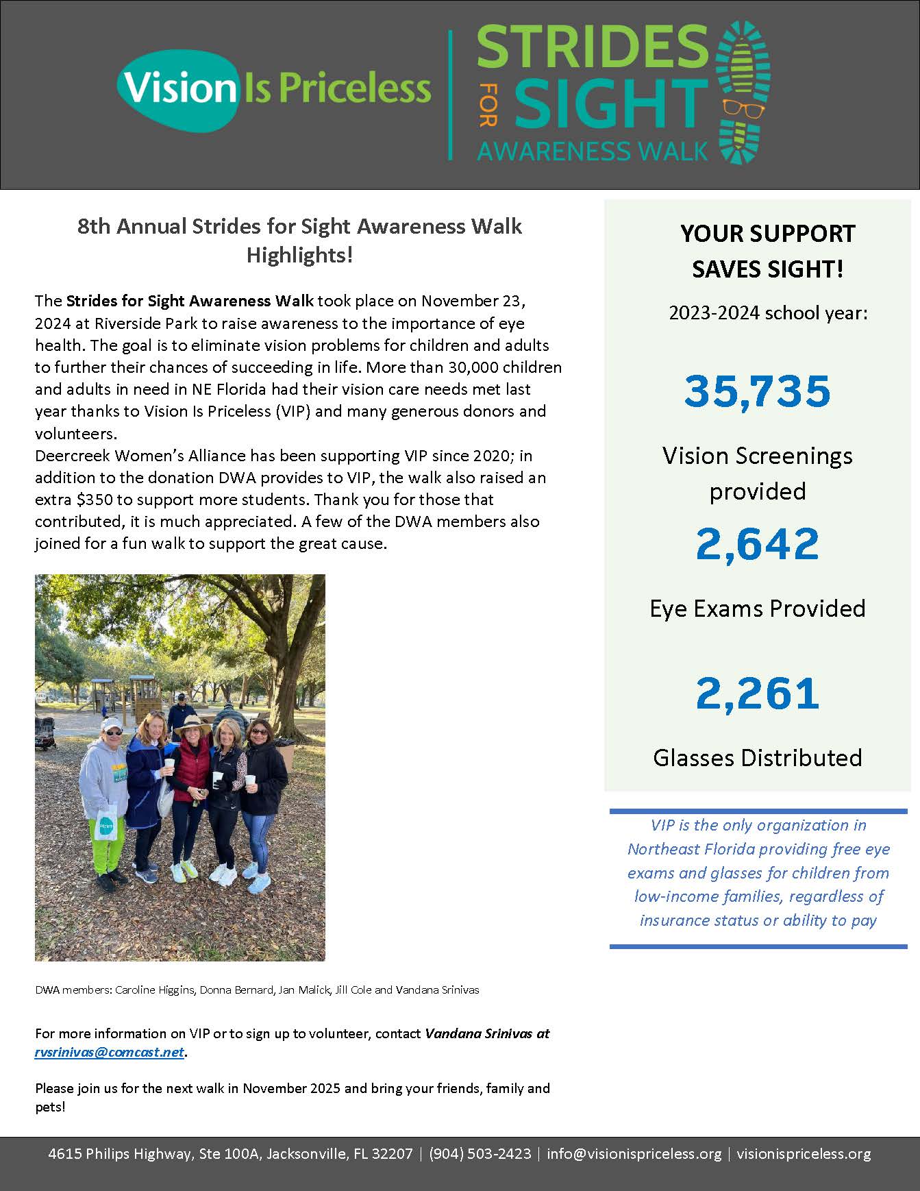 A group from the DWA participated in the Vision is Priceless Strides for Sight Awareness Walk in November, and as a result, they sent us this newsletter to highlight the good things ViP is doing for our community.