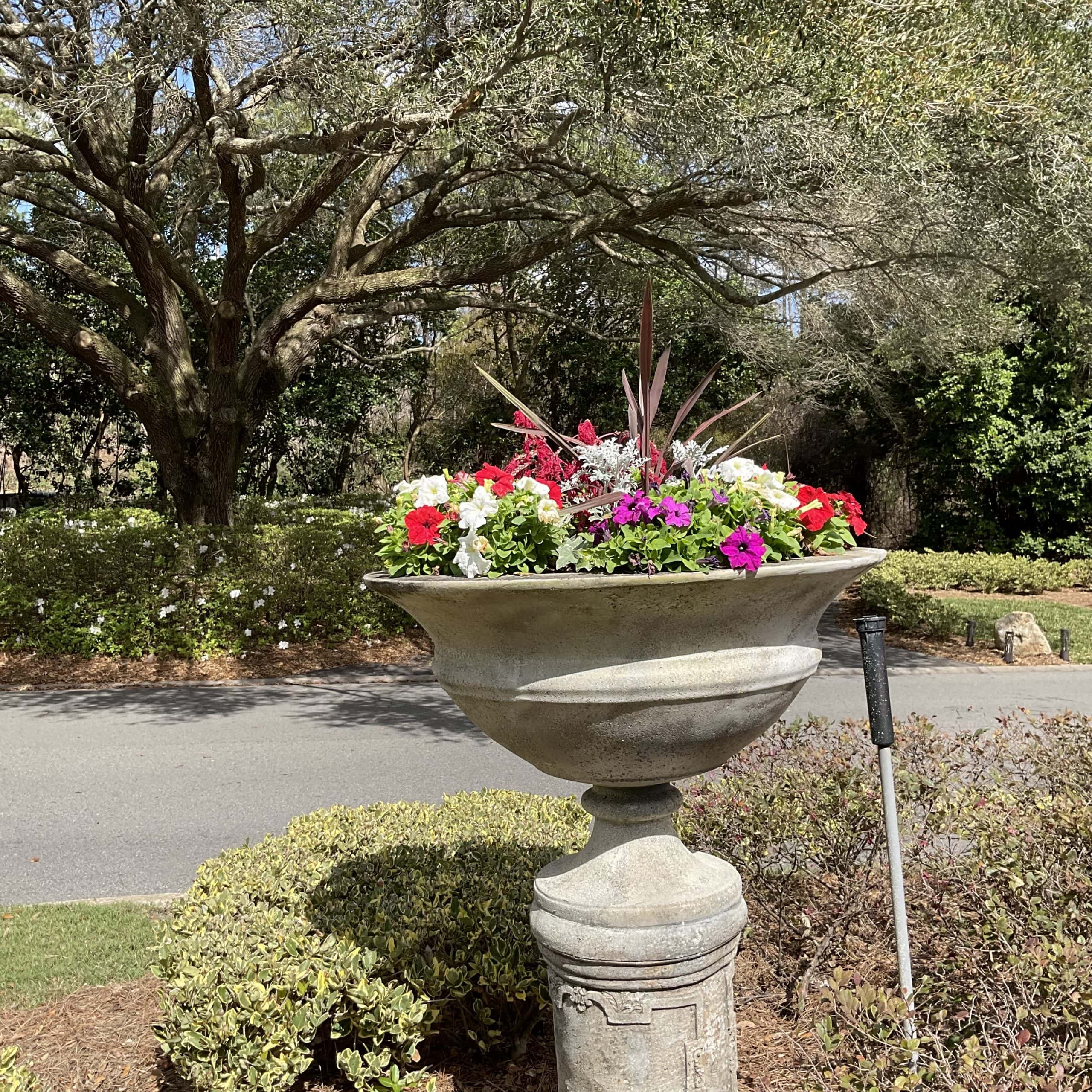 Lorraine Clancy, our Home & Garden Club expert gardener, regularly checks on the state of the areas that we are responsible for and removed the old plants and replanted the urn. By mid-February, on an 80F day, this is what it looked like!